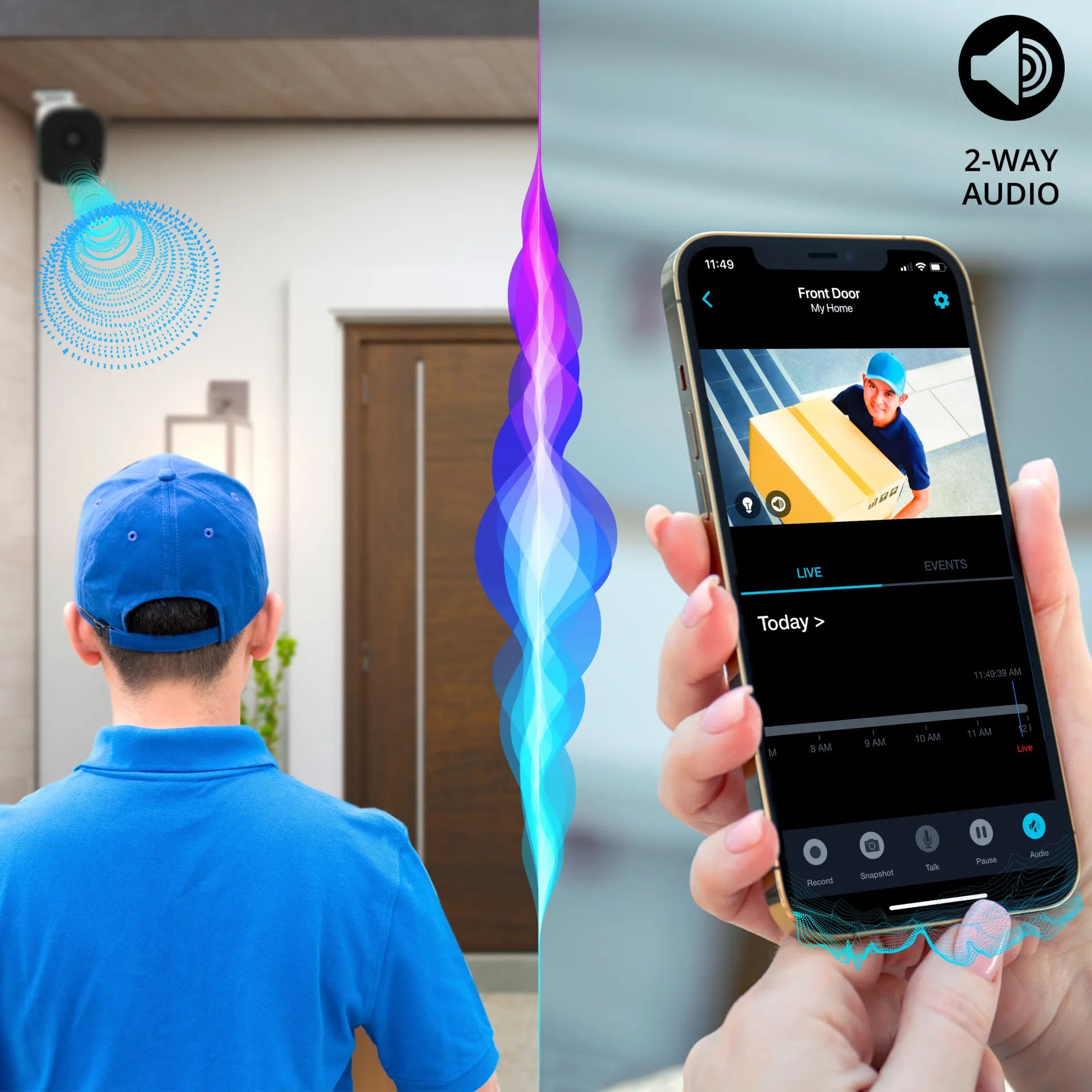 Use the app to send a preset message to a guest, ward off trespassers with a loud siren or listen & talk with someone on your property with our clear and static free 2-way audio.