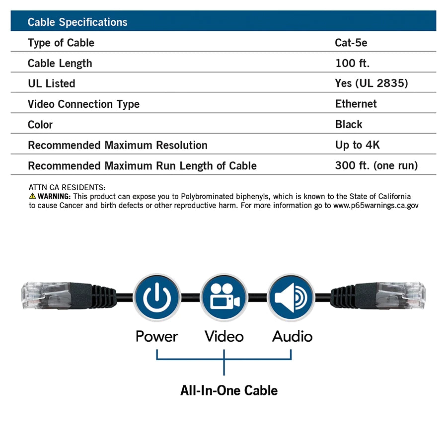 - Cat-5e Ethernet Cable: 100 ft. Video/Power/Audio Extension Cable