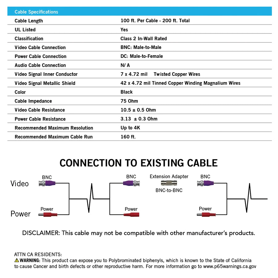 100 ft In-Wall Rated BNC Video-Power Extension Cable with Extension Adapter