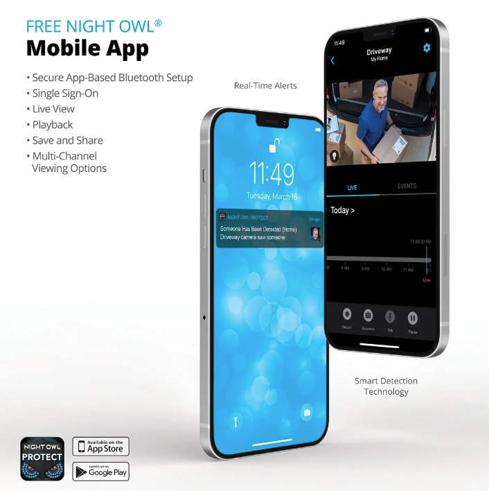 (3) Night Owl® apps are free downloads compatible with Apple® and Android™ devices only. Compatibility at the time of manufacturing. Future Android™ and iOS® updates may affect the app experience.