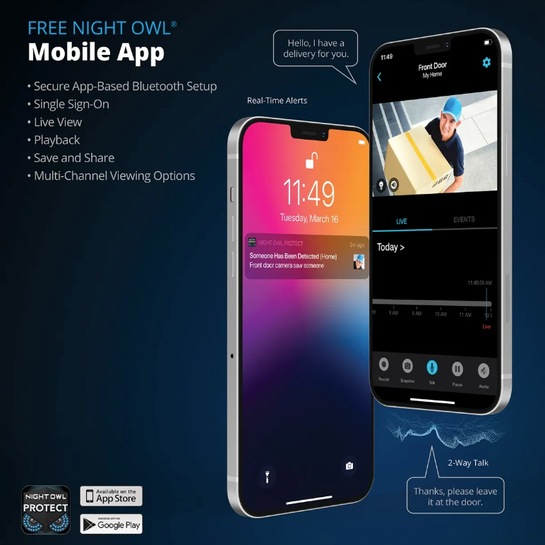(3) Night Owl® apps are free downloads compatible with Apple® and Android™ devices only. Compatibility at the time of manufacturing. Future Android™ and iOS® updates may affect the app experience.