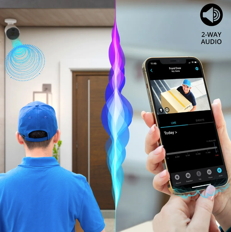 When used with our free app, you will be able to hear what’s happening and speak through your cameras in real time.